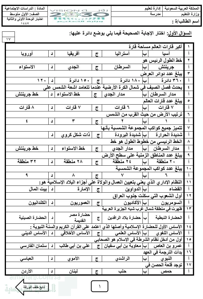 معلومات الملف: أسئلة اختبار الوحدتين الأولى الكون و الأرض و الوحدة الثانية الحضارات من مقرر الدراسات الاجتماعية للفصل الأول من العام 1447ه | ||