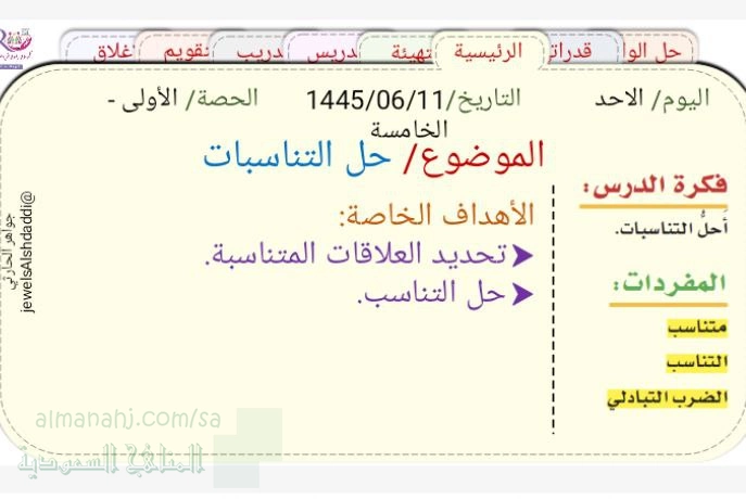 معلومات الملف: عرض بوربوينت مفصل للدرس الخامس حل التناسبات من الباب الرابع النسبة و التناسب من مقرر رياضيات الفصل الأول 1447ه، الأهداف الخاصة : _ تحديد العلاقات المتناسبة _ حل التناسب | ||