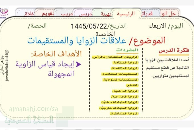 معلومات الملف: عرض بوربوينت 1 لدرس العلاقات بين الزوايا و المستقيمات لمقرر رياضيات الفصل الأول 1447ه، فكرة الدرس : إيجاد قياس الزوايا المجهولة فكرة الدرس: أحدد العلاقات بين الزوايا الناتجة عن قطع مستقيم لمستقيمين متوازيين | ||