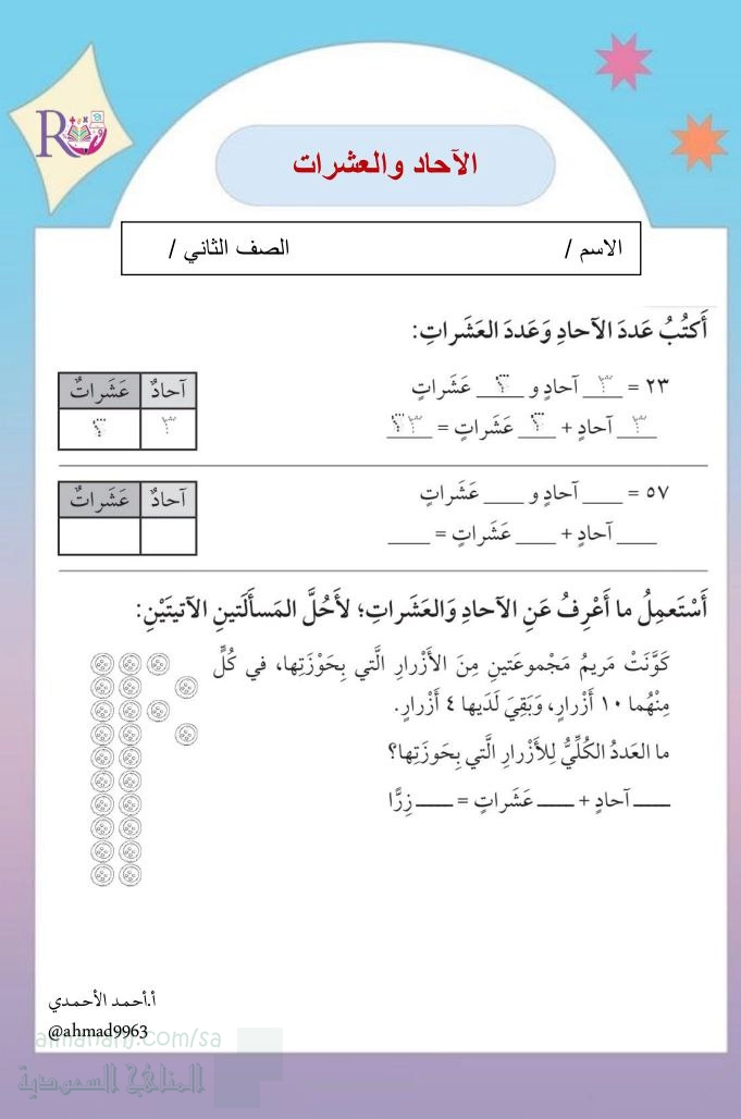معلومات الملف: أوراق عمل شاملة لدروس فصل القيمة المنزلية والأنماط التالية : _ الآحاد والعشرات _ القيمة المنزلية للأعداد حتى 100 _ أحل المسألة استعمل الاستدلال المنطقي _ قراءة الأعداد و كتابتها _ تقدير الكميات _ ترتيب الأعداد _ مقارنة الأعداد