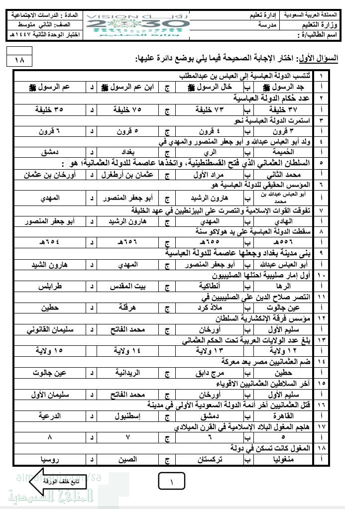 معلومات الملف: اختبار الوحدة الثانية الدولة العباسية و الدول المتتابعة من مقرر اجتماعيات الفصل الأول 1447ه‍ التي تتضمن الدروس التالية: _ الدولة العباسية وأبرز خلفائها _ امتداد الدولة العباسية _ نهاية الدولة العباسية _ الدولة العثمانية