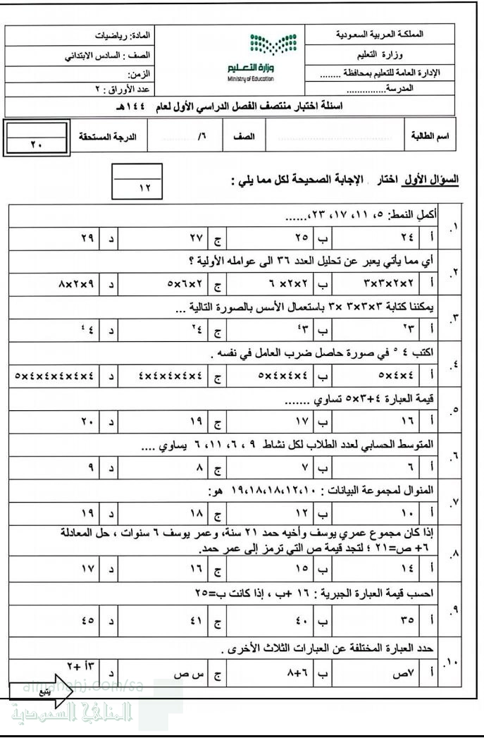أنت هنا: موقع المناهجالمناهج السعودية الصف السادس رياضيات الفصل الأول اختبارات