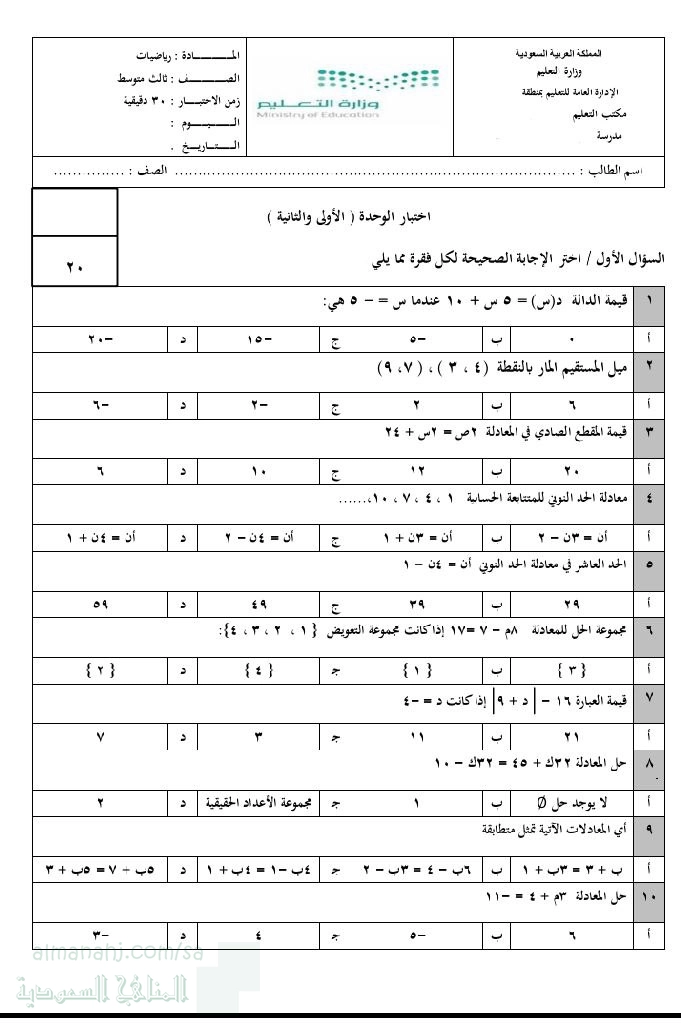 أنت هنا: موقع المناهجالمناهج السعودية الصف الثالث المتوسط رياضيات الفصل الأول اختبارات