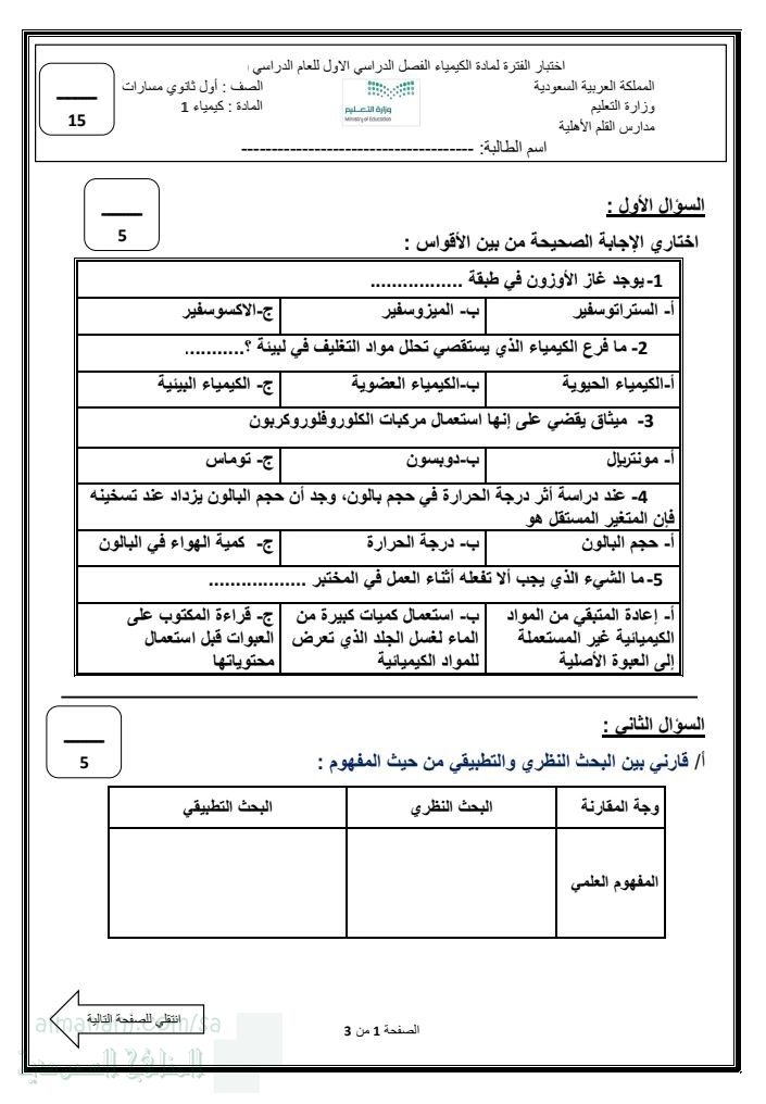 اختبار الفترة مع الحل 1447ه‍ مسارات, الصف الأول الثانوي, كيمياء, الفصل الأول, 1447_1448 - المناهج السعودية