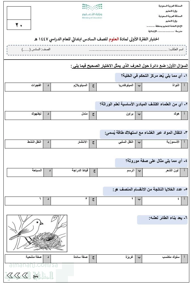أنت هنا: موقع المناهجالمناهج السعودية الصف السادس علوم الفصل الأول اختبارات