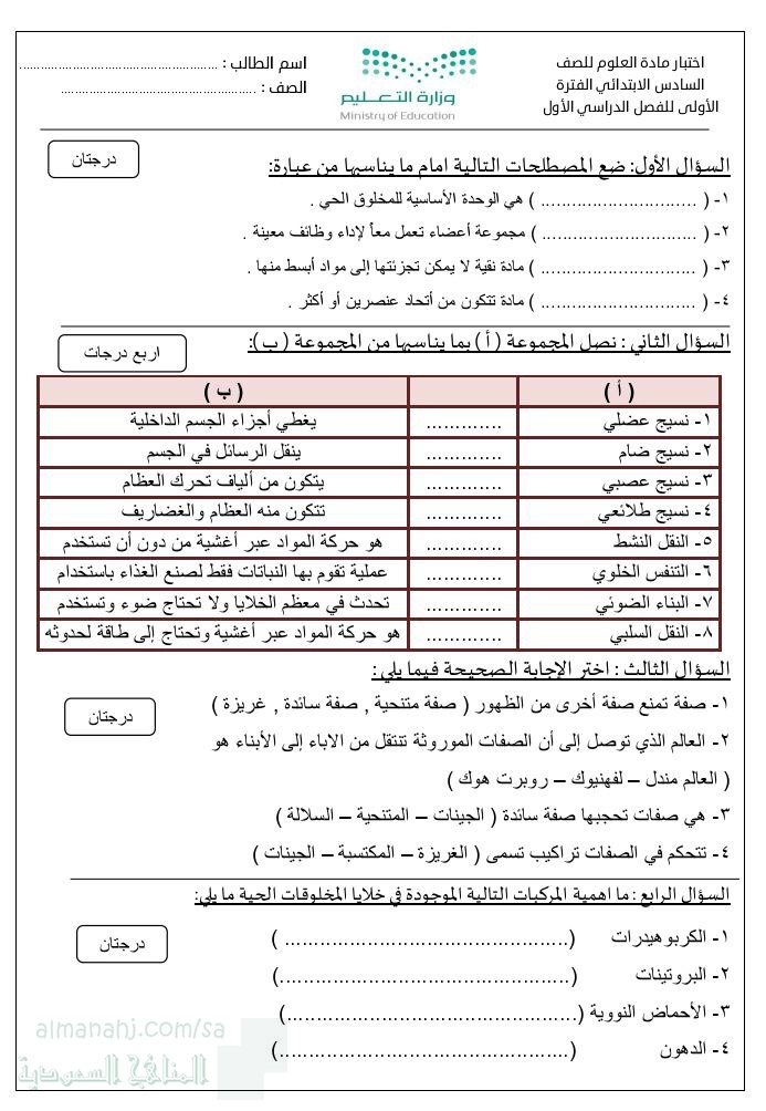 نموذج اختبار الفترة الأولى الوحدة الأولى 1447ه‍, الصف السادس, علوم, الفصل الأول, 1447_1448 - المناهج السعودية