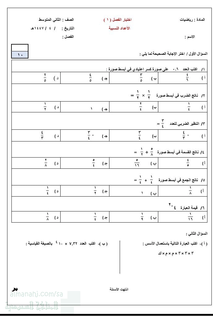 5. الصف الثاني المتوسط, رياضيات, نموذج اختبار الفصل الأول الأعداد النسبية