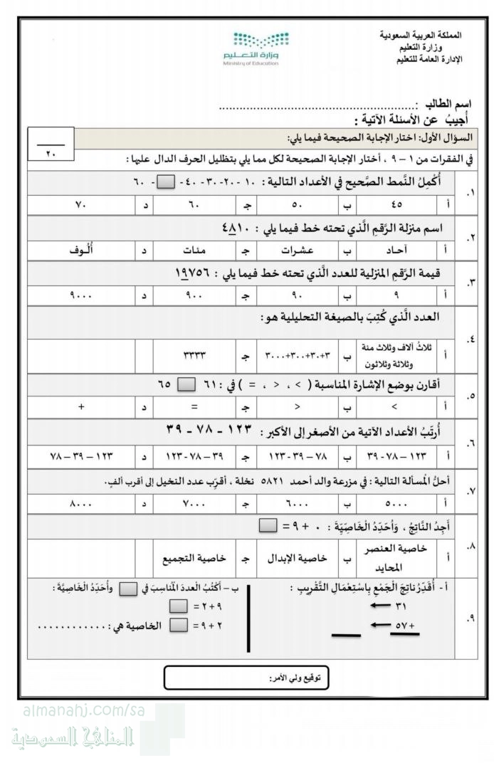معلومات الملف: نموذج اختبار الفترة الأولى الدور الأول من الفصل الثاني للعام 1447ه‍ الاسئلة شاملة لدروس فصول المقرر التالية: الفصل الأول: القيمة المنزلية الفصل الثاني: الجمع الفصل الثالث: الطرح