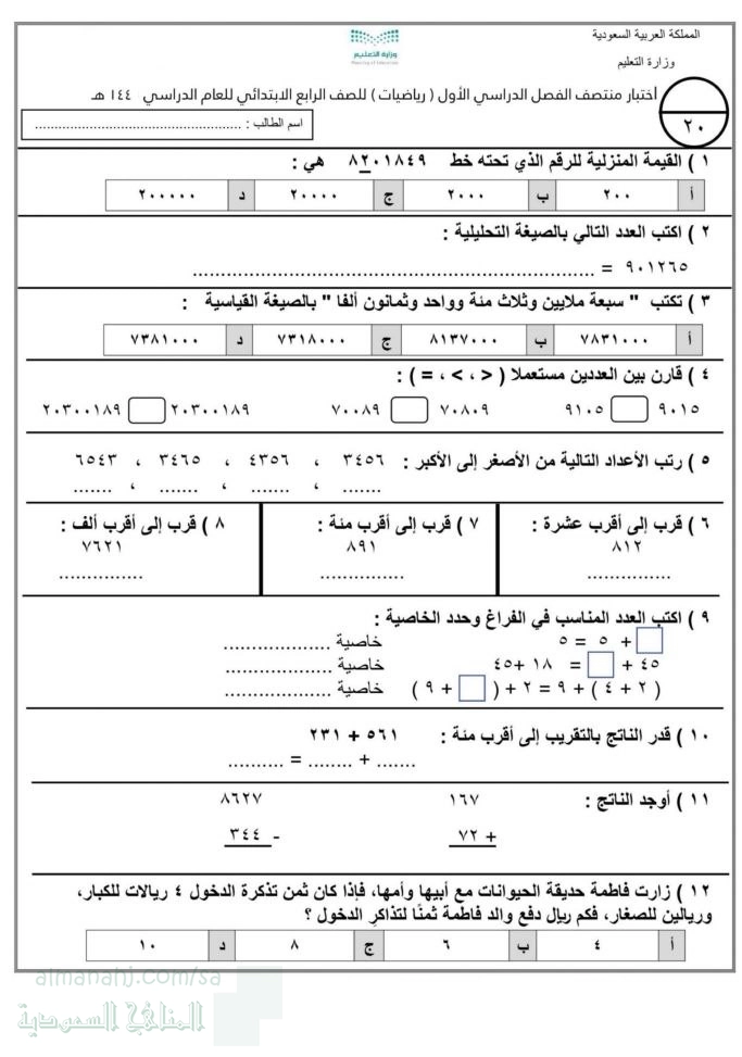 معلومات الملف: نموذج اختبار الفترة منتصف الفصل للعام 1447ه‍ يقيس الاختبار المهارات الأساسية للمقرر : _ إيجاد القيمة المنزلية _ تقريب الأعداد _ ترتيب الأعداد تصاعديا _ إيجاد ناتج الجمع _ تقريب الأعداد إلى أقرب مئة