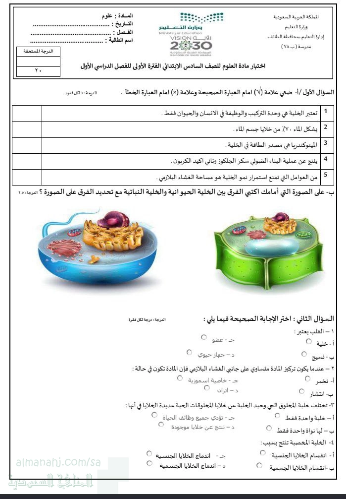 2. علوم, الفصل الأول, 1447_1448, نماذج متعددة في اختبار الفترة الأولى 1447ه‍ مرفقة بالحلول