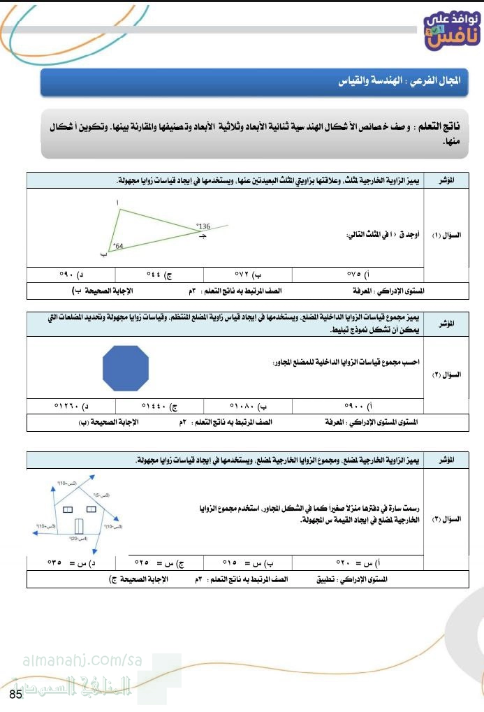 معلومات الملف: نماذج متنوعة من اختبارات نافس في مجال الرياضيات مع المؤشرات : ويشمل مايلي: _ المجال الفرعي الهندسة و القياس _ الإحداثيات و التحويلات الهندسية الجبر و التحليل _ الأعداد و العمليات عليه _ الإحصاء و التمثيلات البيانية _ تمثيل البيانات وتغسيرها _ حساب الاحتمالات | ||