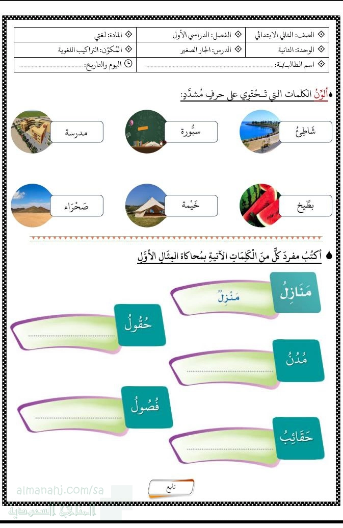 3. لغة عربية, الفصل الأول, 1447_1448, ورقة عمل الجار الصغير التراكيب اللغوية
