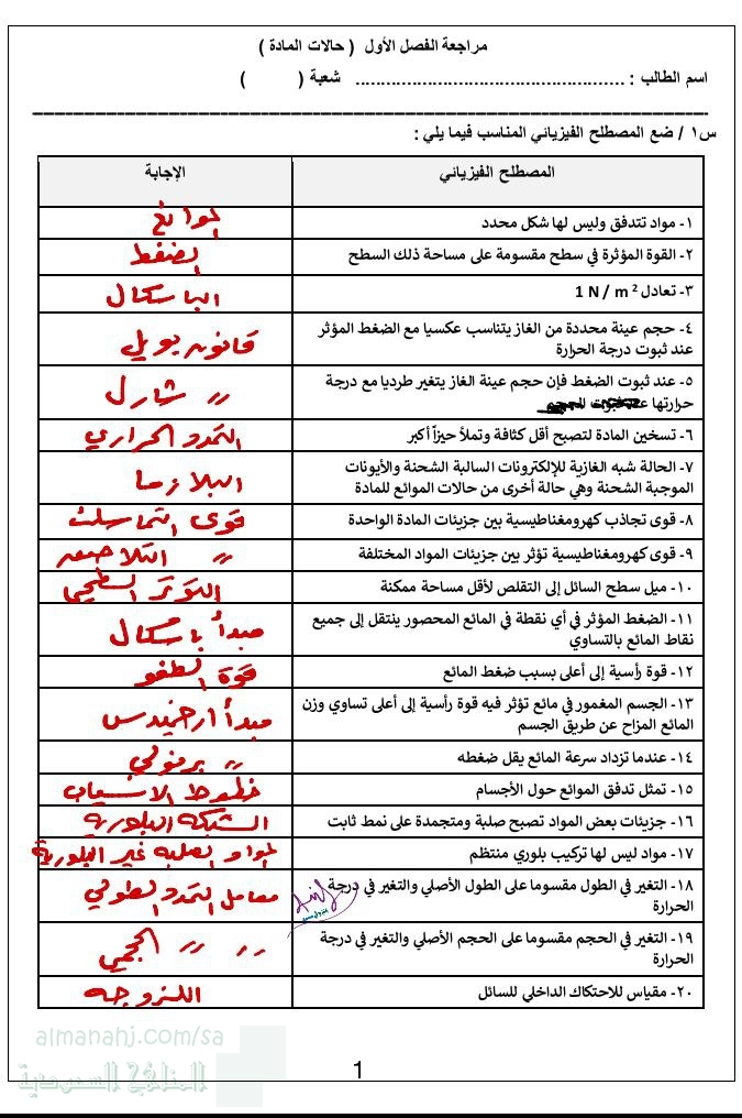 5. بنك أسئلة وملزمة فيزياء الفصل الأول حالات المادة مع الحل