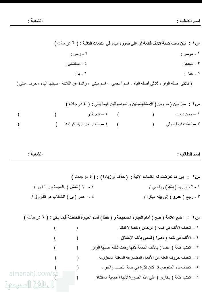 معلومات الملف: نموذج اختبار نهاية الوحدة الإملائية قضايا إملائية من مقرر الكفايات اللغوية للعام 1447ه‍ الأسئلة شاملة لمهارات الوحدة تقيس مهارات الطالب في تفسير كتابة الألف مقصورة أو ممدودة ، التمييز بين ما و من الاستفهاميتين و الموصولتين ، الحذف و الزيادة ،