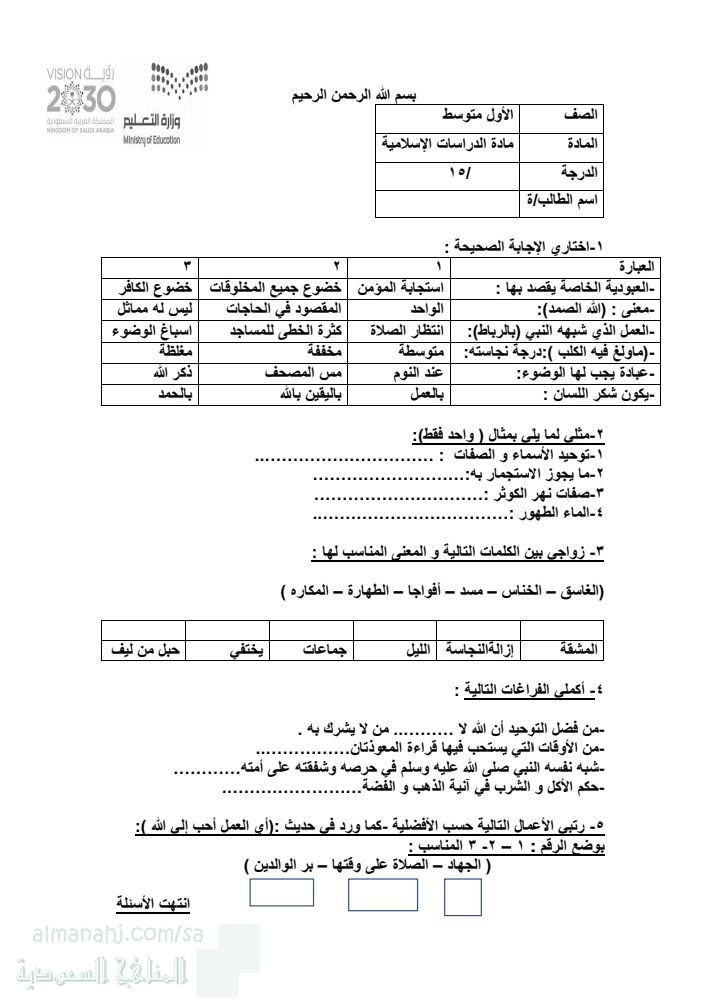 8. الصف الأول المتوسط, دراسات اسلامية, نموذجا اختبار الفترة الأولى 1447ه