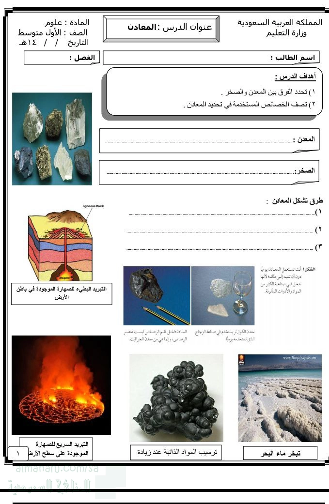 1. الصف الأول المتوسط, علوم, أسئلة درس المعادن من دون حل