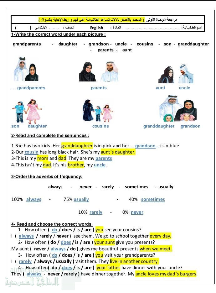 تم إيجاد الملف: مراجعة شاملة للوحدة الأولى family events محلولة