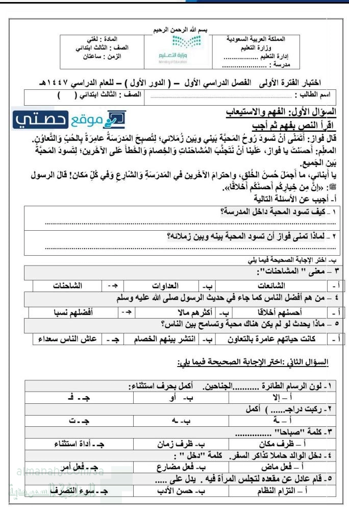 2. الصف الثالث, لغة عربية, نماذج اختبارات لغتي الفترة الأولى 1447ه مع الإجابات