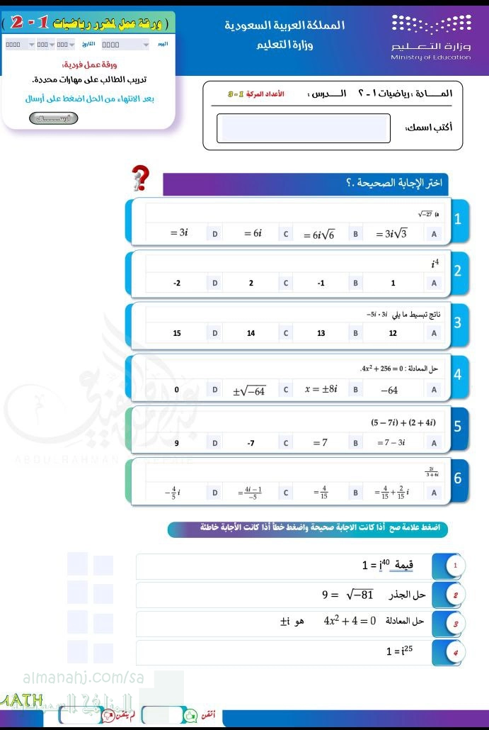 1. رياضيات, الفصل الأول, 1447_1448, ورقة عمل الأعداد المركبة 1447ه‍