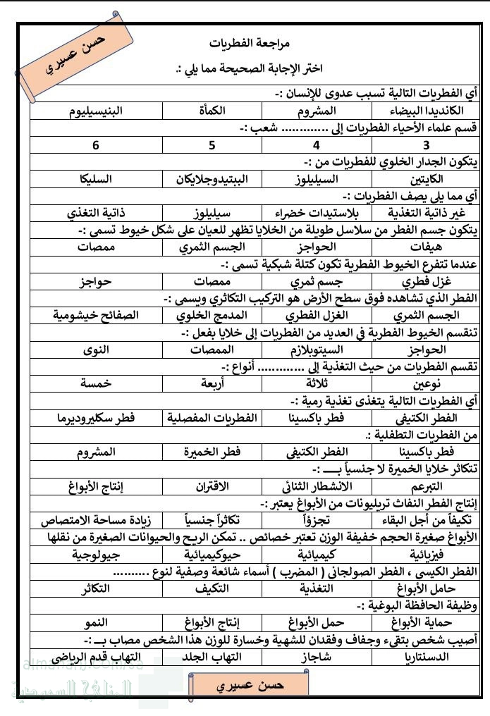 1. علوم, الفصل الأول, 1447_1448, مراجعة الفصل الخامس الفطريات أحياء 1