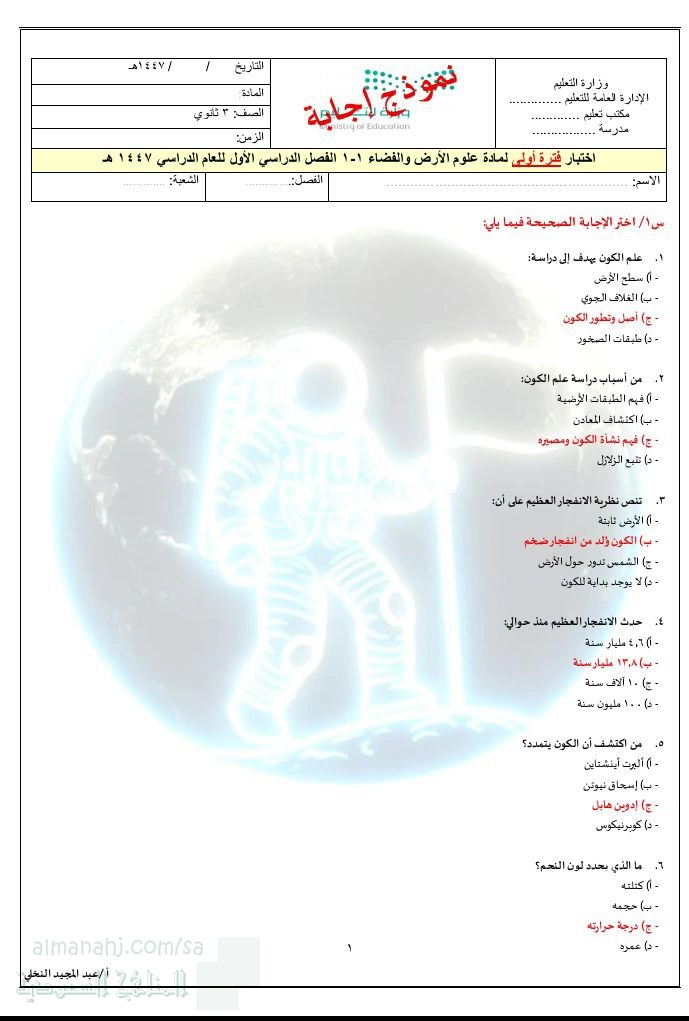تم إيجاد الملف: اختبار الفترة الأولى علوم الأرض والفضاء نموذج الإجابة