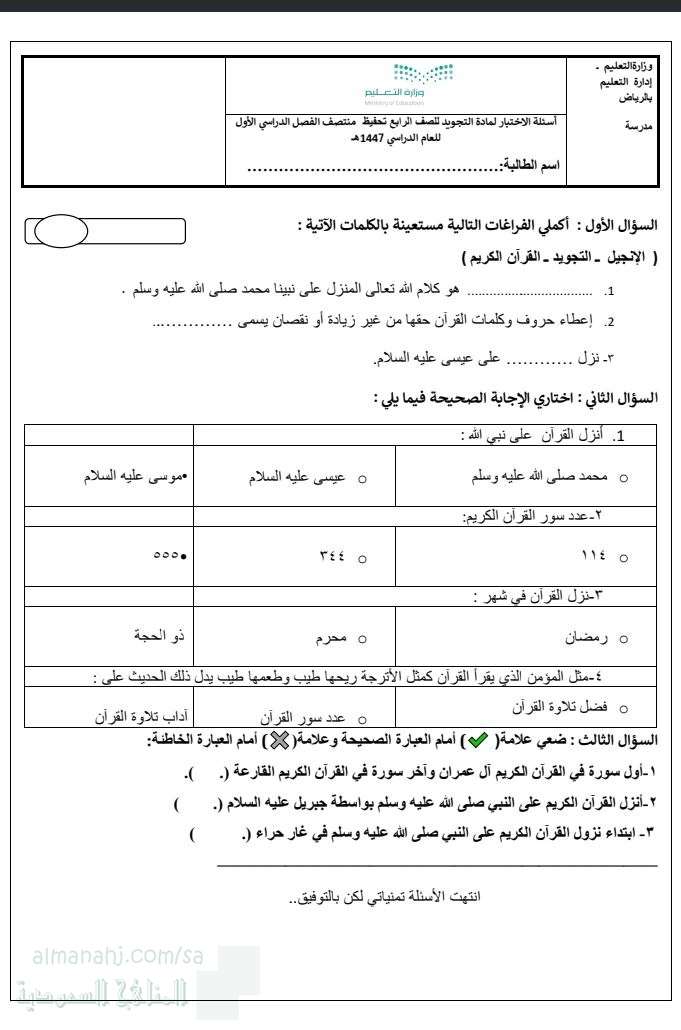 تم إيجاد الملف: نموذجا اختبار تجويد الفترة الأولى و منتصف الفصل