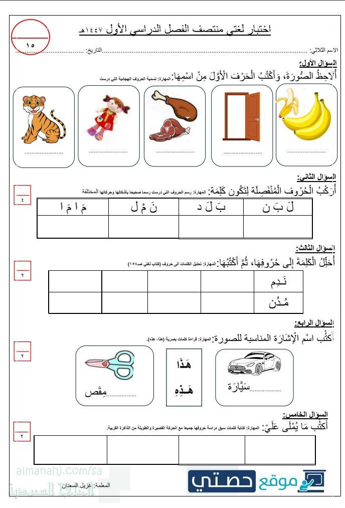 معلومات الملف: نموذج اختبار الفترة في لغتي الجميلة للفصل الأول من العام الدراسي 1447ه‍ ، مرفق بنموذج الإجابة تشمل الأسئلة المهارات الأساسية للمقرر مهارة قراءة الصور ، تكوين كلمة من حروف منفصلة ، تحليل الكلمة إلى حروف ، كتابة إسم الإشارة المناسب