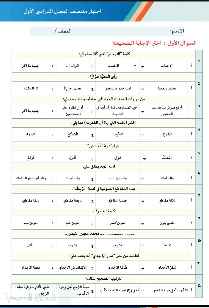 12. لغة عربية, الفصل الأول, المفال نموذج ال, نموذج اختبار لغتي منتصف الفصل 1447ه‍