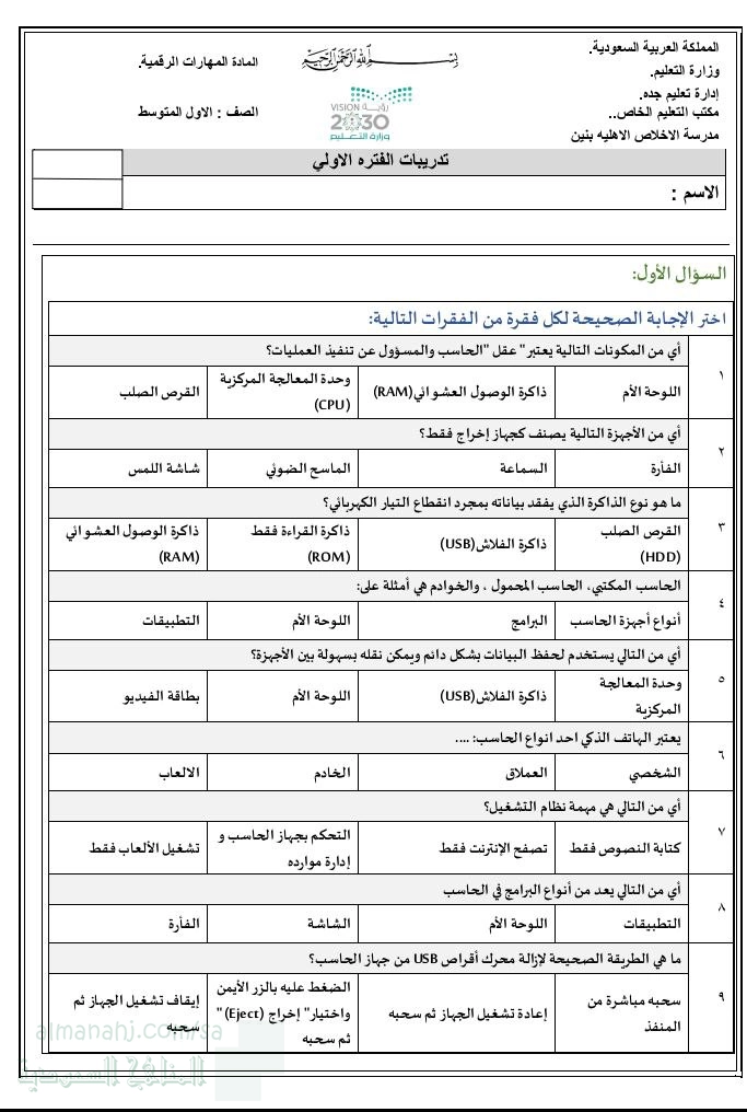 أسئلة وتدريبات منهج الرقمية من غير حل للفصل الأول 1447ه | ||