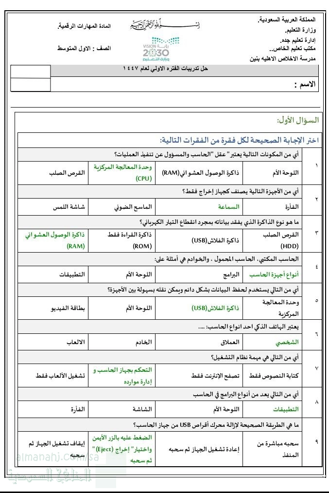 نموذج الإجابة على أسئلة وتدريبات منهج الرقمية للفصل الأول 1447ه | ||
