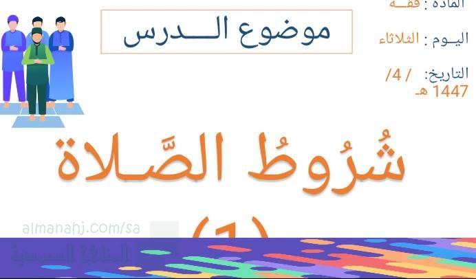 معلومات الملف: عرض بوربوينت للدرس السابع شروط الصلاة من منهج الفقه و السلوك مقرر الإسلامية للفصل الأول من العام 1447ه أهداف الدرس: أن يذكر الطالب شروط الصلاة أن يوضح عورة المرأة و الرجل في الصلاة أن يببن متى يؤمر الصغير بالصلاة | ||
