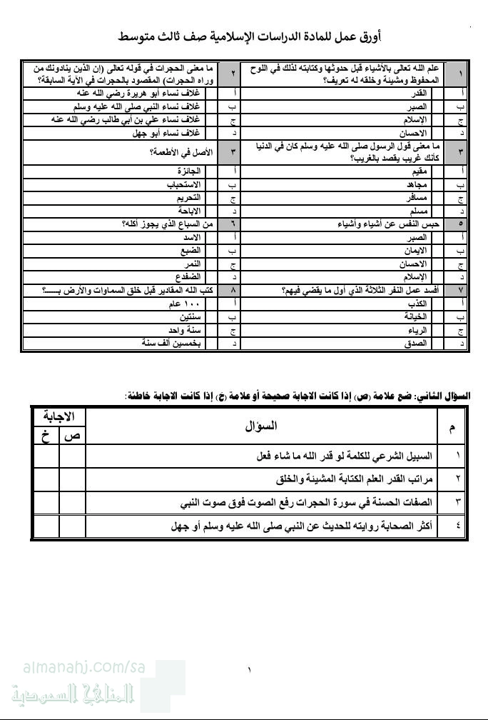 أوراق عمل إسلامية غير محلولة للفصل الأول 1447ه | ||
