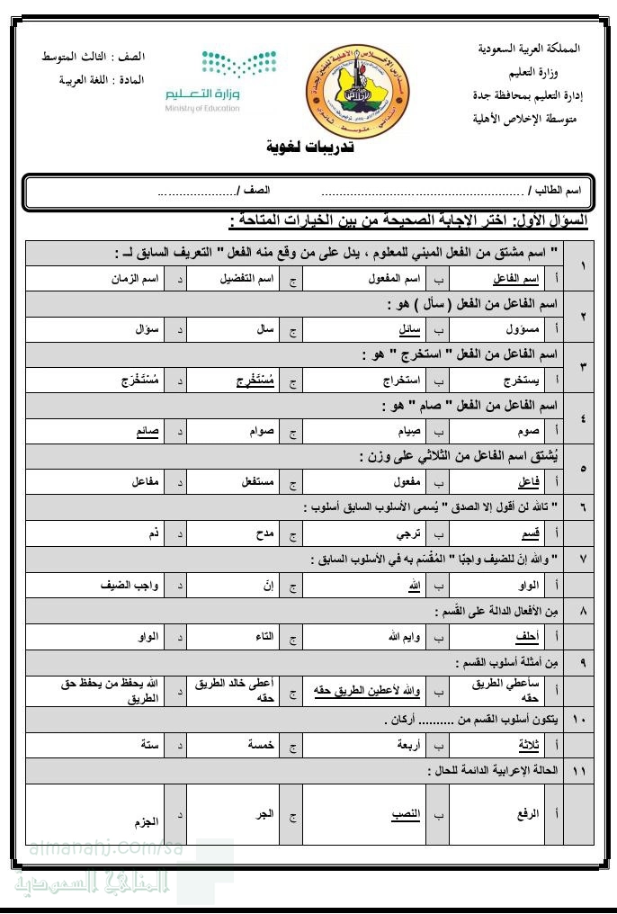 تم إيجاد الملف: نموذج حل أسئلة التدريبات اللغوية