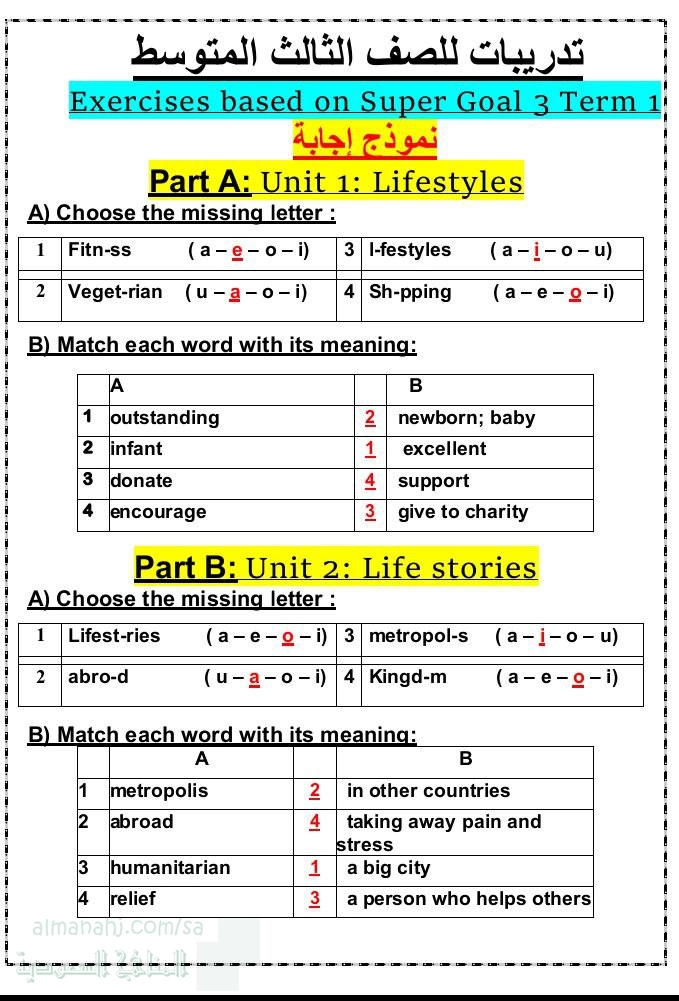 معلومات الملف: نموذج حل أسئلة تدريبات الوحدة الأولى lifestyles من مقرر اللغة الإنجليزية super goal 3 للفصل الأول من العام 1447ه الإجابة في ملفنا التالي | ||