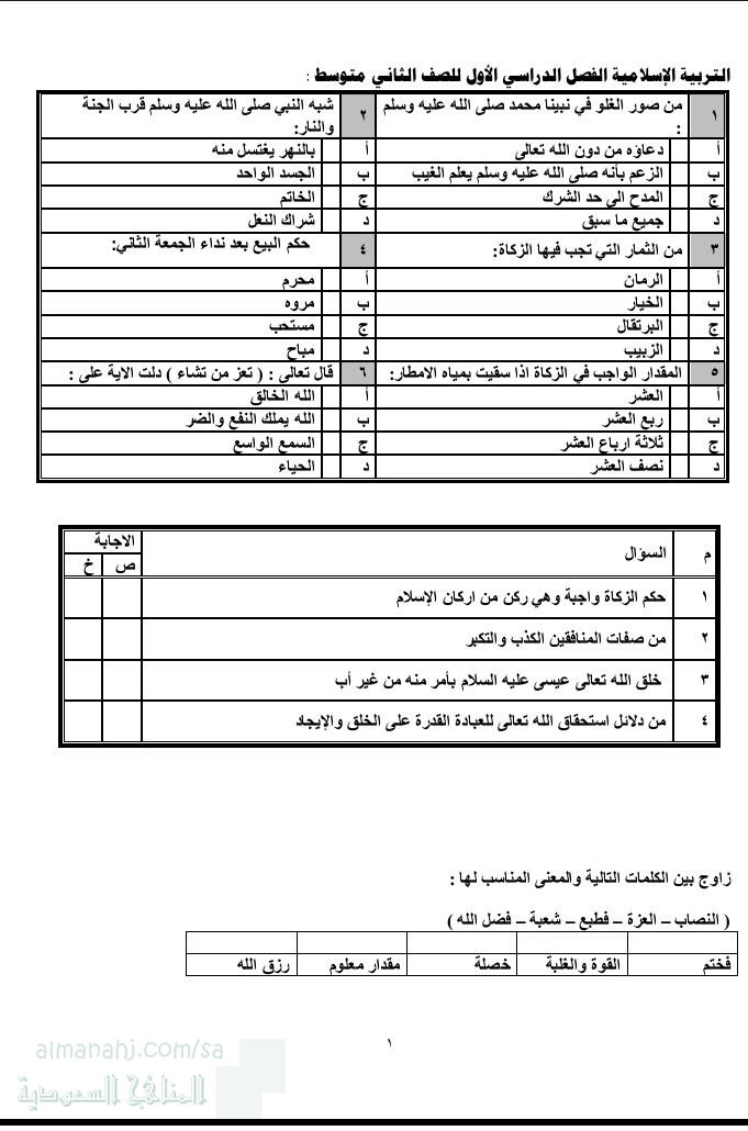 أسئلة تدريبات إسلامية للفصل الأول 1447ه | ||