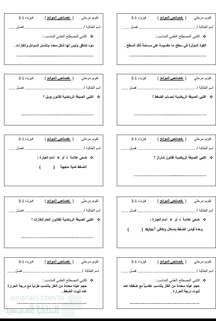 معلومات الملف: تقويم مرحلي للدرس الأول خصائص الموائع من الفصل الأول حالات المادة من مقرر فيزياء 3 للفصل الأول من العام 1447ه | ||