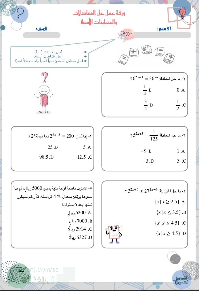تم إيجاد الملف: ورقة عمل حل المعادلات والمتباينات الأسية