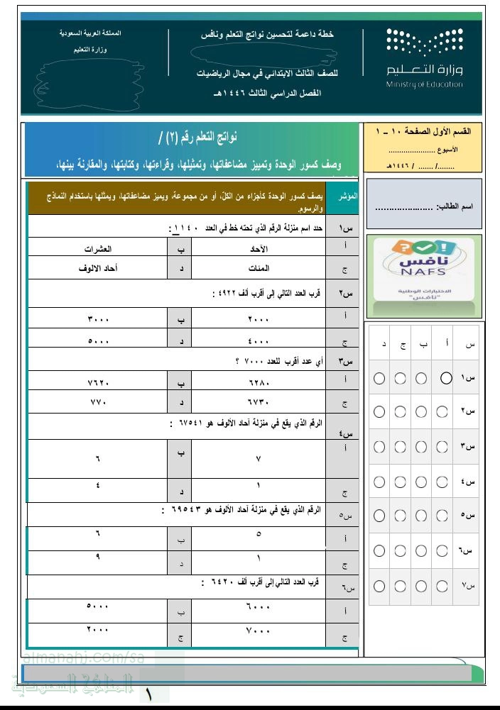 معلومات الملف: ملزمة نافس في مجال الرياضيات خطة داعمة لتحسين نواتج التعلم و نافس نواتج التعلم: _ وصف كسور الوحدة كأجزاء من الكل و تمييز مضاعفاتها _ وصف الأعداد ضمن أربع منازل _ وصف كسور الوحدة و تمييز مضاعفاتها _ جمع الأعداد الكلية ضمن ثلاث منازل و طرحها _ حل مسائل رياضية من خطوة أو خطوتين بالإضافة إلى اختبارات تجريبية | ||