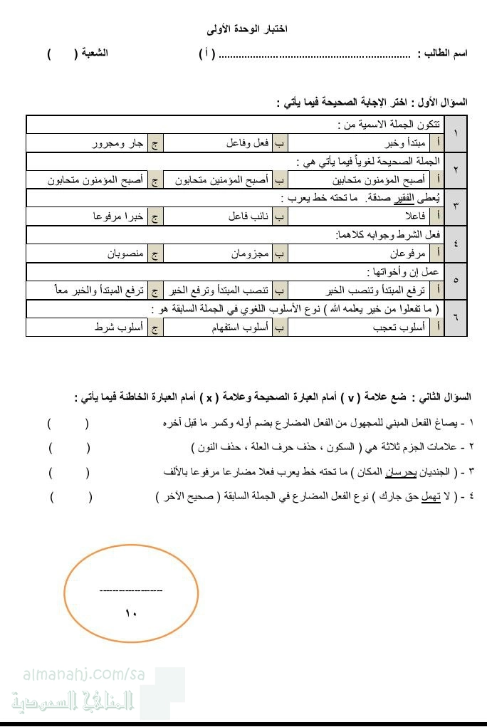 اختبار للوحدتين الأولى والثانية كفايات لغوية | ||