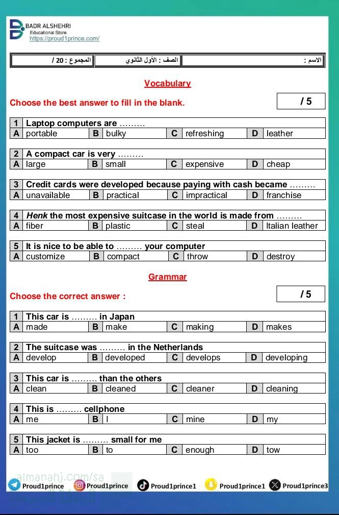 معلومات الملف: تقييم الوحدة الرابعة the art of advertising من منهج top goal 1 للفصل الأول من العام 1447ه مع الحل المتضمنة الدروس التالية: _ Writing _ Form, meaning and function _ the art of advertising _ Project | ||