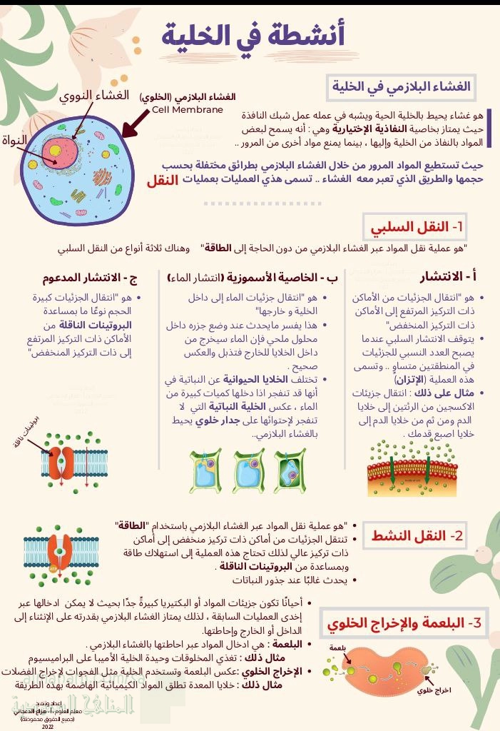 معلومات الملف: عرض و شرح درس أنشطة في الخلية النقل من مقرر العلوم للفصل الأول 1447ه‍ يتعرف الطالب من خلاله على : _ الغشاء البلازمي في الخلية _ النقل السلبي _ النقل النشط _ البلعمة و الإخراج الخلوي
