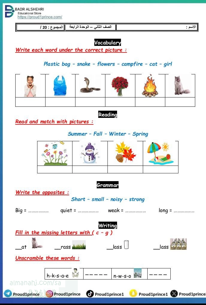 معلومات الملف: تقييم الوحدة الرابعة Beautiful Nature الطبيعة الجميلة من منهج اللغة الإنجليزية we can 3 للفصل الأول من العام 1447ه تتضمن الوحدة الدروس التالية: الدرس الأول وقت التحدث : Talk Time الدرس الثاني : الايقاعات والاستماع Rhythms and Listening الدرس الثالث الكلمات Words in action الدرس الرابع الصوتيات Fonics | ||