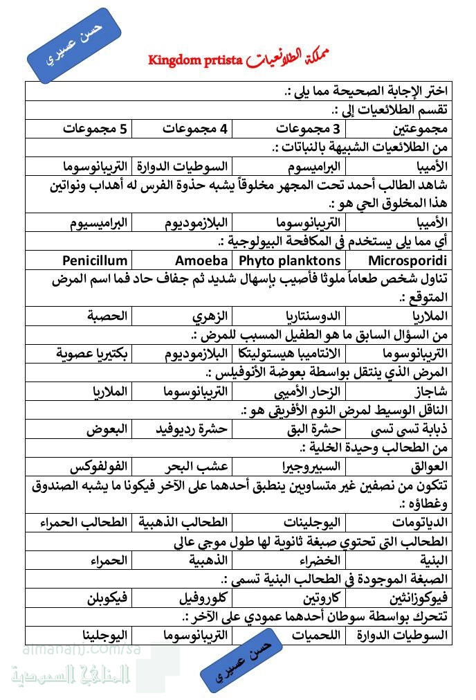 2. الصف الأول الثانوي, علوم, أسئلة شاملة للفصل الرابع مملكة الطلائعيات