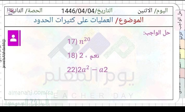معلومات الملف: عرض بوربوينت الجزء الثاني لدرس العمليات على كثيرات الحدود من مقرر رياضيات 2 للفصل الأول 1447ه يبدأ العرض بحل الواجب ثم اختبار قصير أهداف الدرس : _ ضرب وحيدة حد في كثيرة حدود _ ضرب كثيرات الحدود _ كتابة عبارة كثيرة الحدود | ||