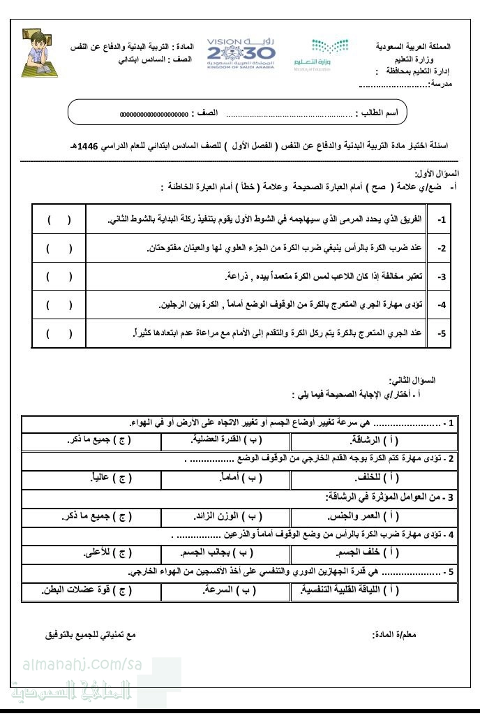 1. الصف السادس, التربية البدنية, نماذج اختبار البدنية للفترة الأولى مع الإجابات