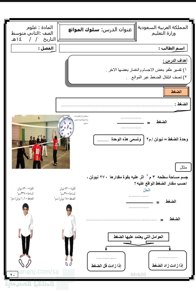 معلومات الملف: شرح تفصيلي جميل لدرس سلوك الموانع من منهج الفصل الأول للعام 1447ه‍ أهداف الدرس : _ تفسير طفو بعض الاجسام و بعضها الآخر _ وصف انتقال الضغط عبر الموانع