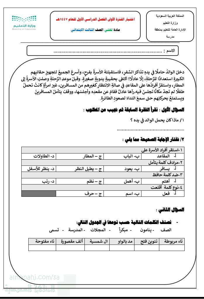 2. الصف الثالث, لغة عربية, نموذج اختبار لغتي الفتري 1447ه