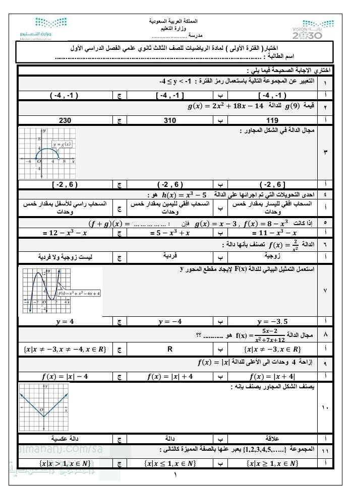 13. رياضيات, الفصل الأول, 1447_1448, اختبار الفترة الأولى فصل تحليل الدوال