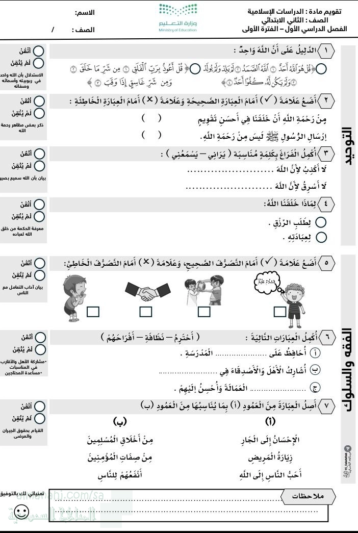 أسئلة تقويم إسلامية توحيد و فقه 1447ه‍