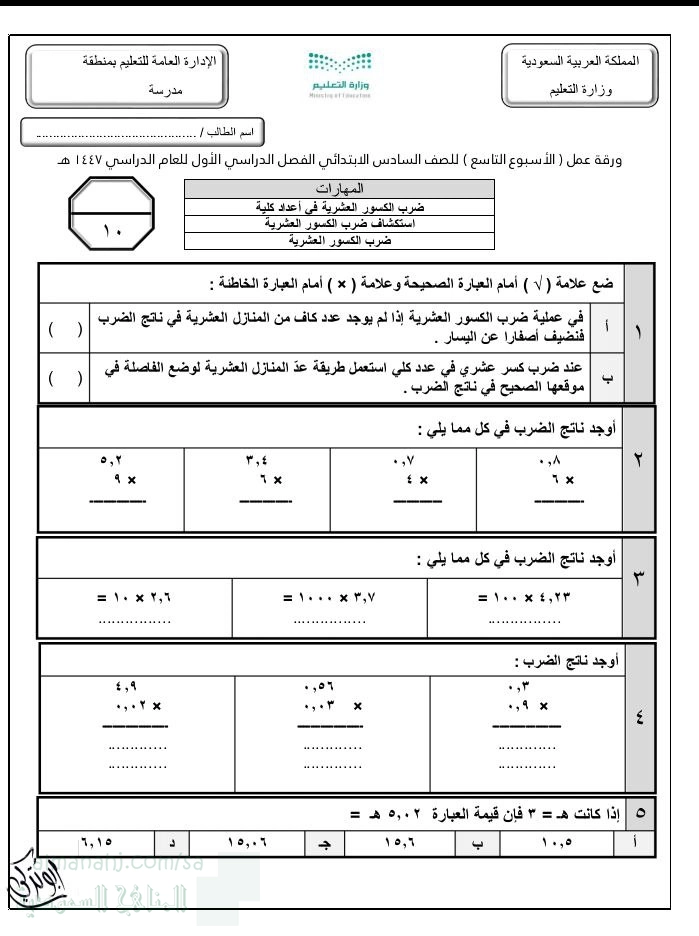 معلومات الملف: ورقة عمل الأسبوع التاسع من الفصل الأول 1447ه‍ نموذج بورقة واحدة المهارات المستهدفة : ضرب الكسور العشرية في أعداد كلية استكشاف ضرب الكسور العشرية ضرب الكسور العشرية